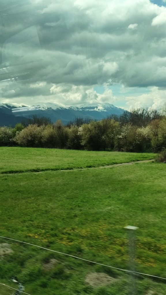 Vor uns liegen die schneebedeckten Berge.