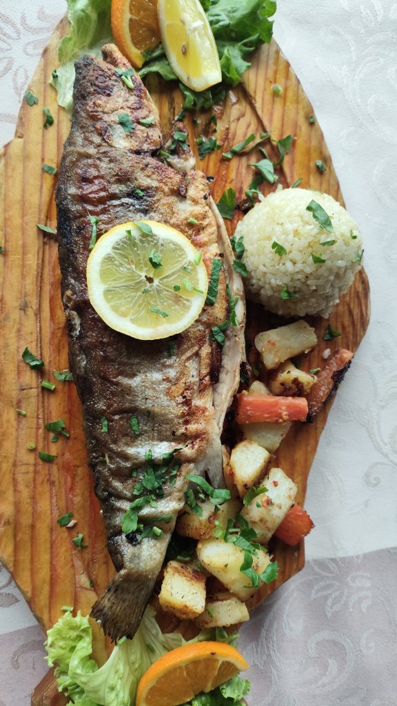 Ohrid Forelle, gefüllt mit Gemüse.